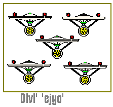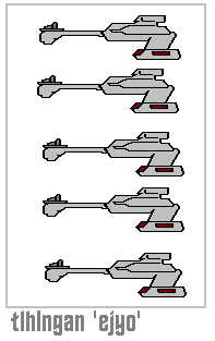 A warrior cries out "tIqtaH to'" (enduring tactics!) on achieving a formation of three vessels in a diagonal, horizontal or vertical row. Often the game was played more simply declaring the space one took "wa' DoD wej", "wej DoD wa'" and so on. You can print out and play the game using the pieces above, with ships from the tlhIngan 'ejyo' (Klingon star fleet) or the DIvI' 'ejyo' (Federation Star Fleet).